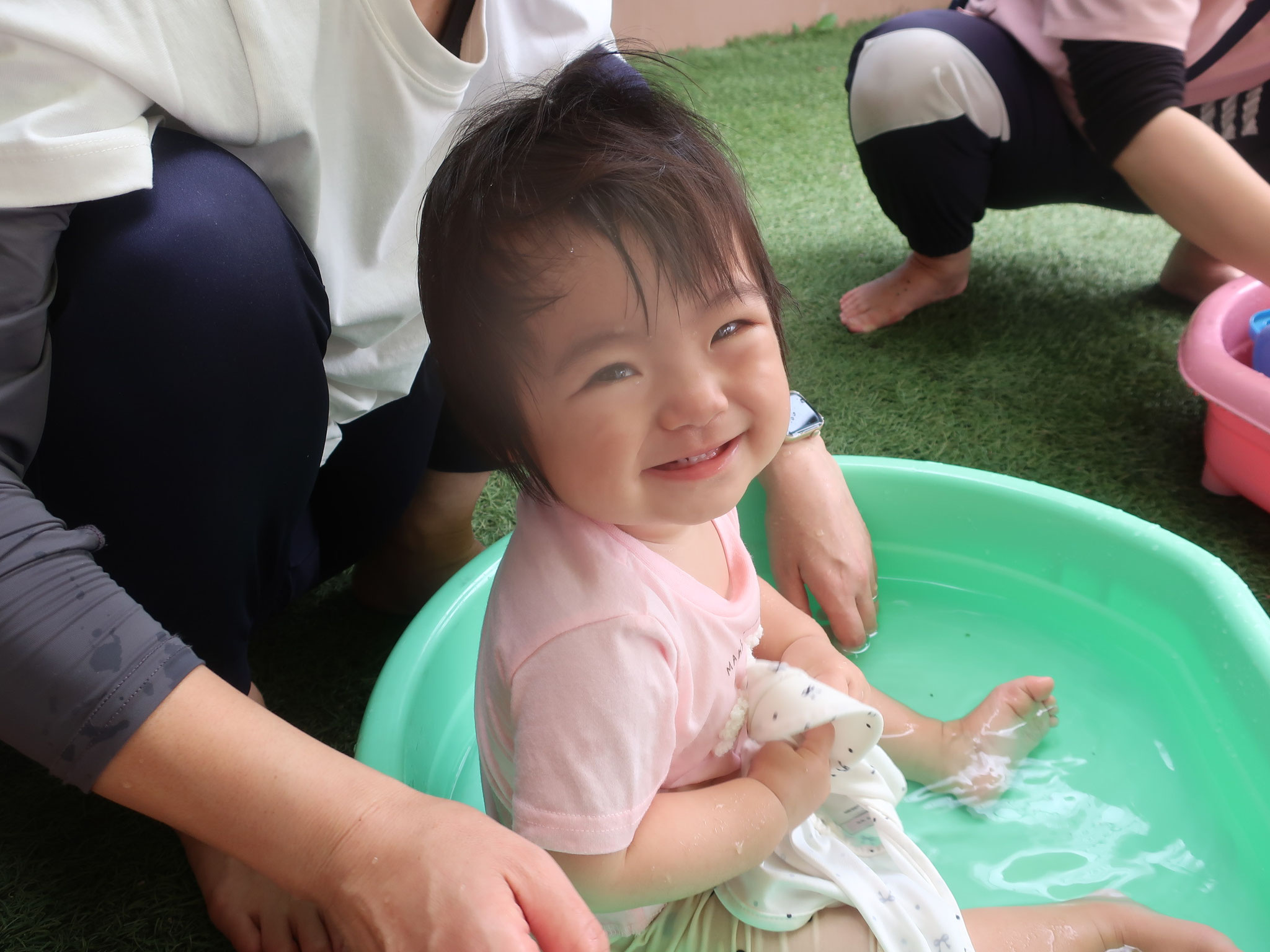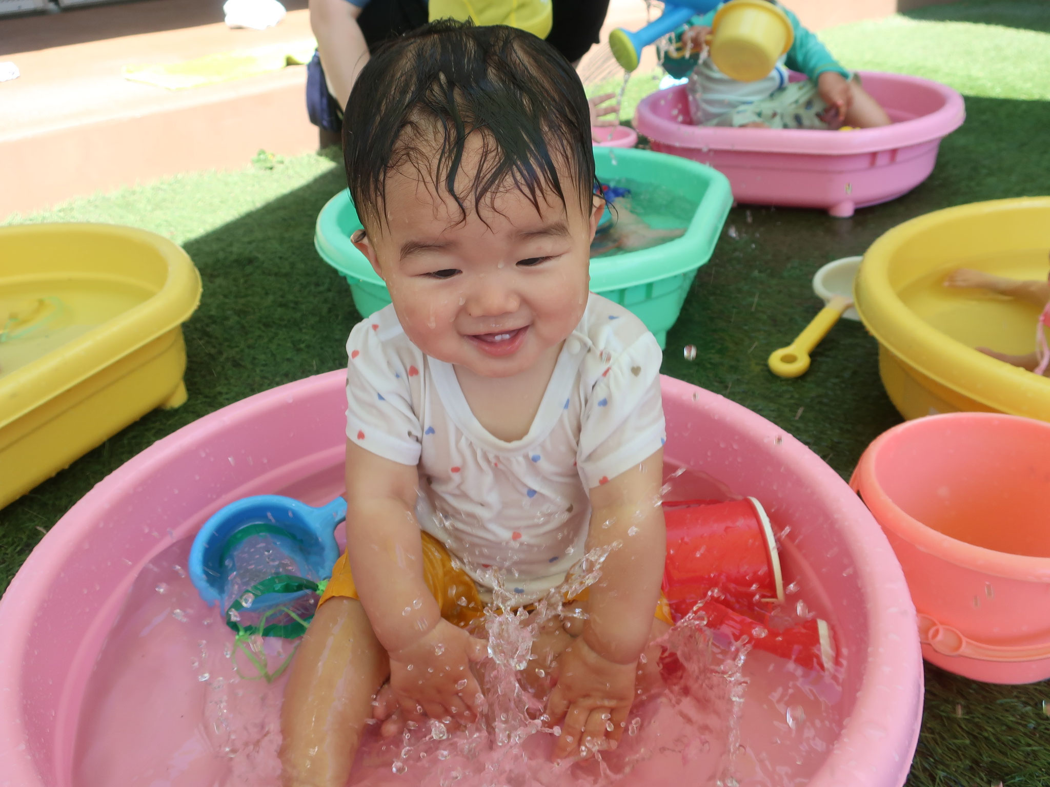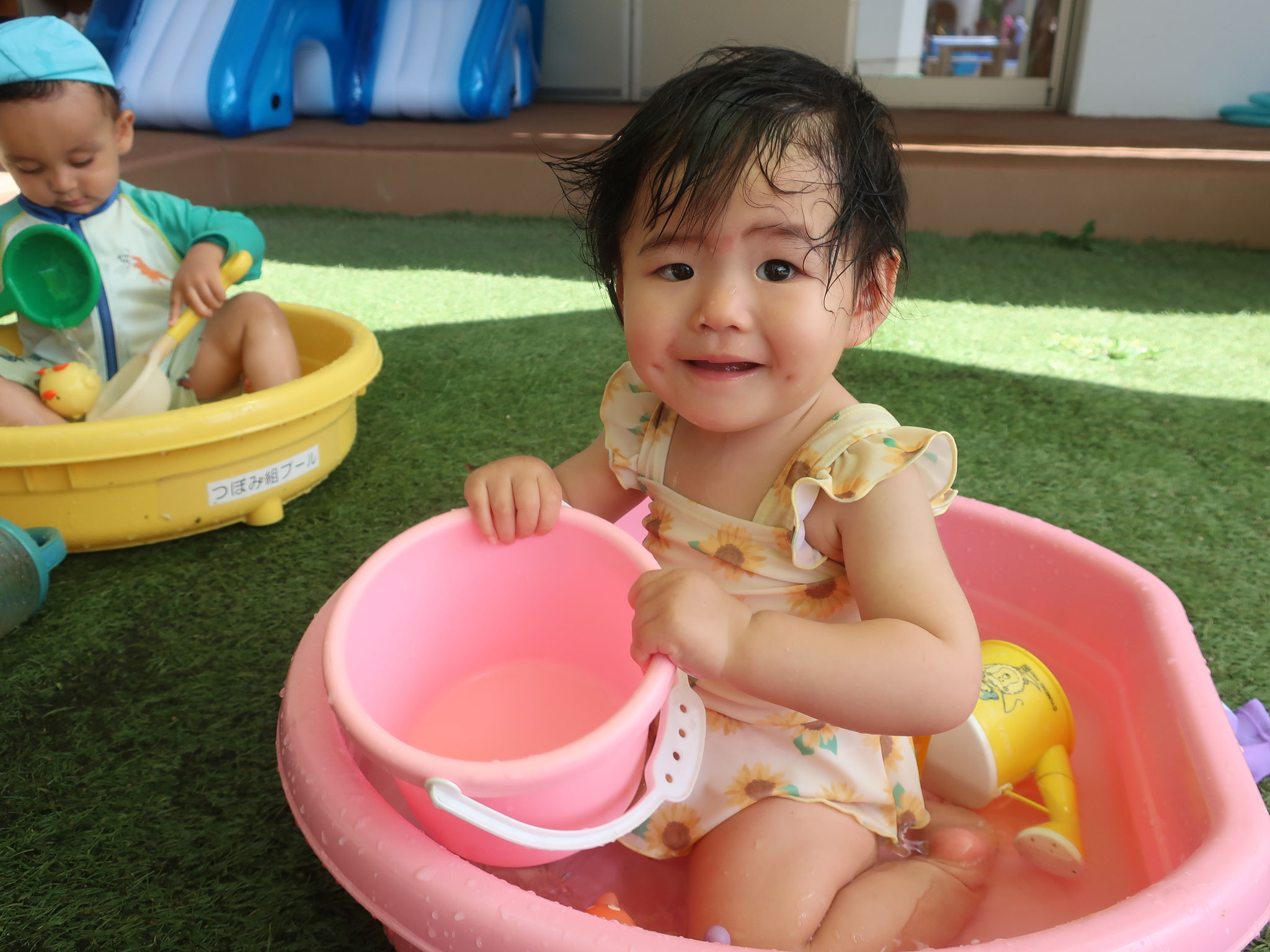 2025/09/05 つぼみ組クラス便り つぼみ組からです。 暑い日が続き、 毎日水遊び日和な夏でした! 水にもすっかり慣れて、 お部屋に入る時間になると 『もっと遊びたーい!』 と言っているかのように、 泣いてしまうお友だちも。 水遊びが大好きになり、 一人一つのタライに ちょこんと座って遊ぶ姿は、 とっても可愛らしいです♪ 来年度は、大きいプールになるので 楽しみですね♡ (柴田) tagPlaceholderカテゴリ: