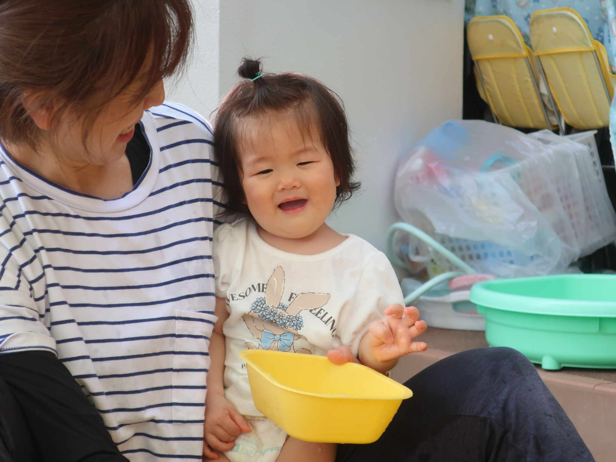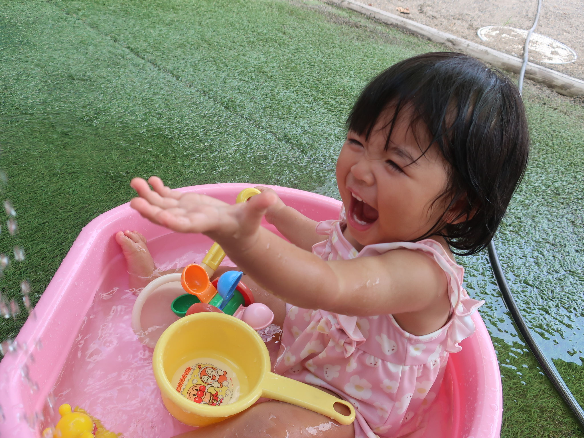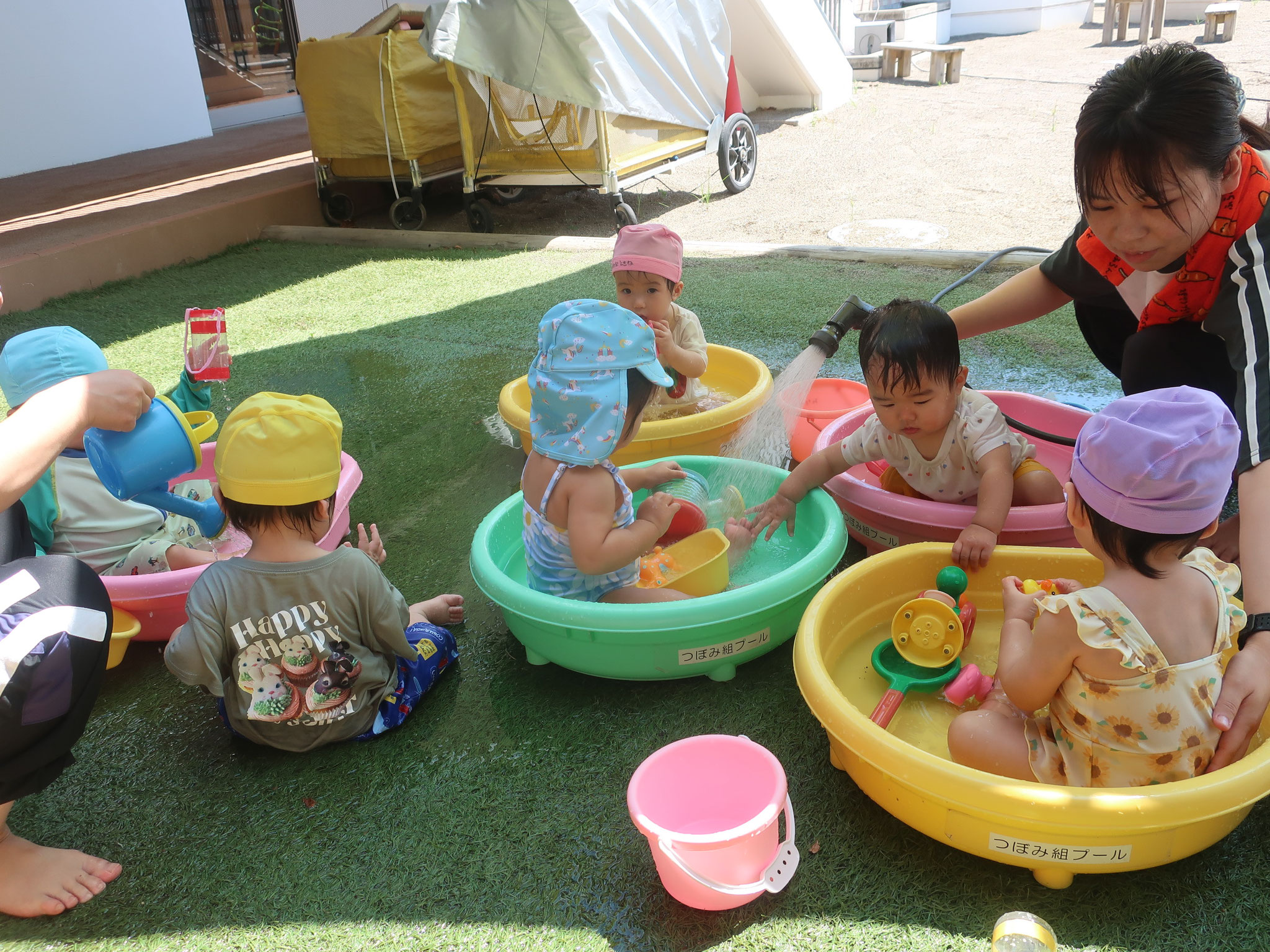 2025/09/05 つぼみ組クラス便り つぼみ組からです。 暑い日が続き、 毎日水遊び日和な夏でした! 水にもすっかり慣れて、 お部屋に入る時間になると 『もっと遊びたーい!』 と言っているかのように、 泣いてしまうお友だちも。 水遊びが大好きになり、 一人一つのタライに ちょこんと座って遊ぶ姿は、 とっても可愛らしいです♪ 来年度は、大きいプールになるので 楽しみですね♡ (柴田) tagPlaceholderカテゴリ: